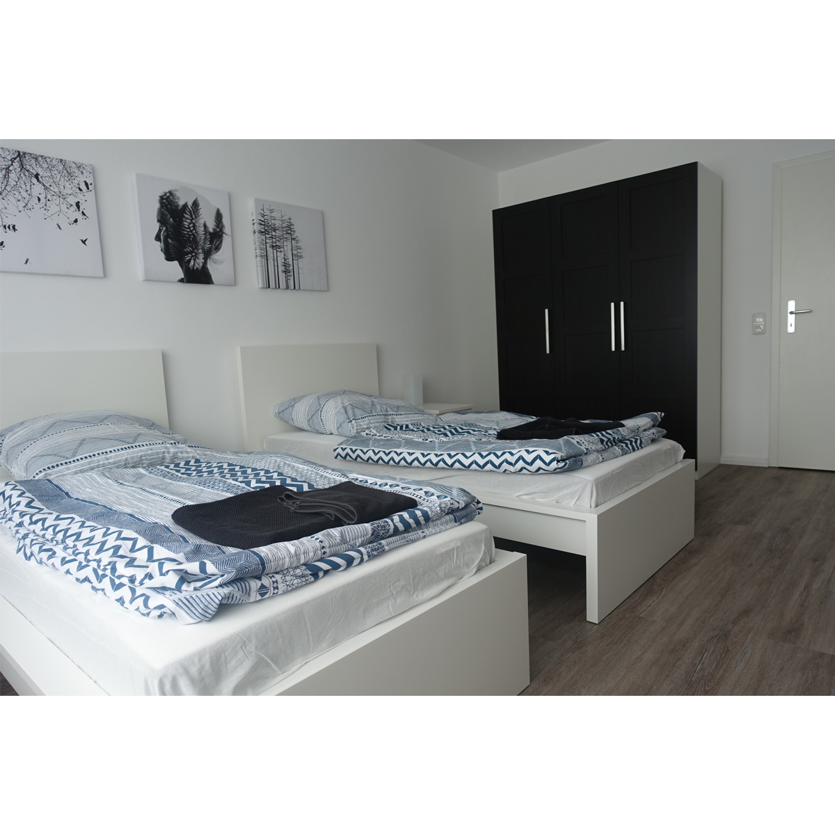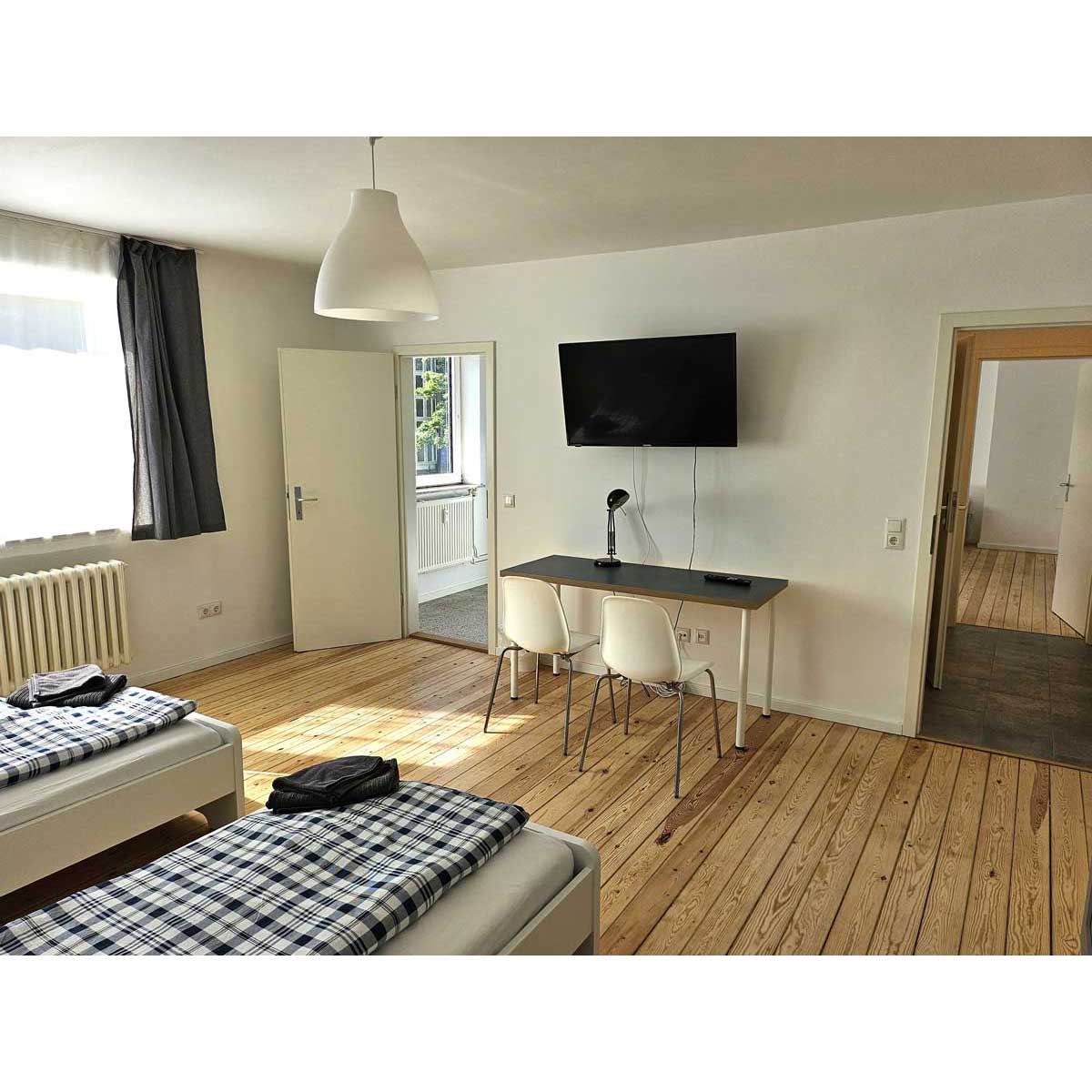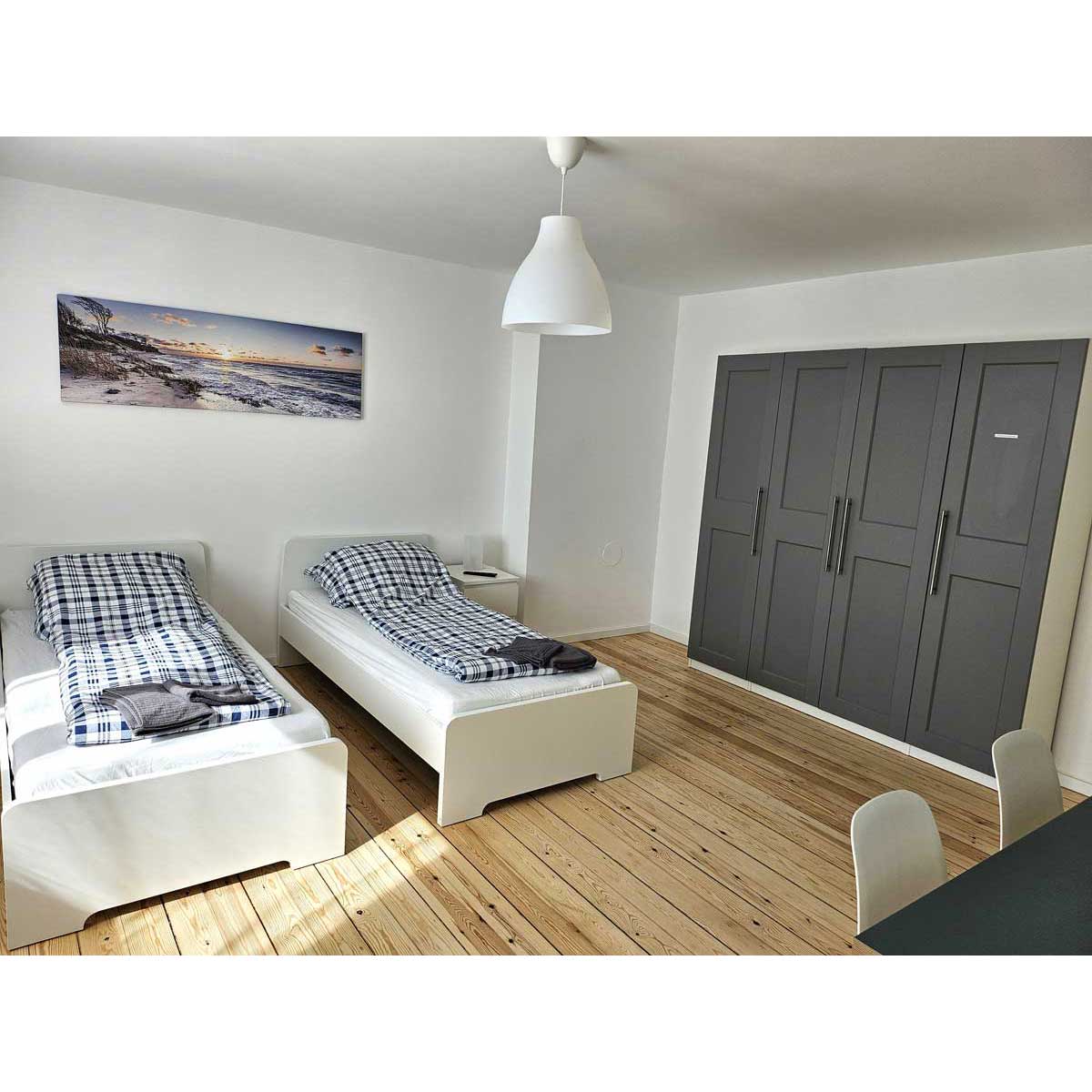 Die hellen 61 qm großen Wohnungen sind unterteilt in zwei Schlafzimmer, ausgestattet mit jeweils zwei freistehenden Einzelbetten und einem Gemeinschaftsraum/Esszimmer. Die Wohnungen bieten ausreichend Platz für vier Personen. Eine komplett ausgestattete Küch mit Geschirrspühler und Waschmaschine und Trockner im Keller bieten beste Voraussetzungen für einen bequemen längeren Aufenthalt. Das kleinere Doppelzimmer verfügt über einen Balkon. WLAN und Kabel-TV sorgen für zeitgemäße Unterhaltung.