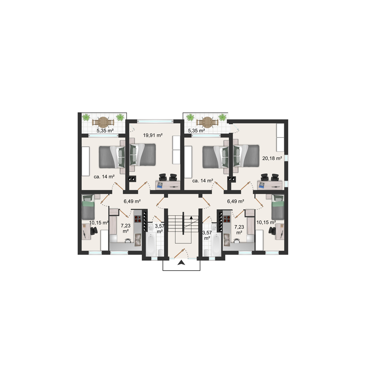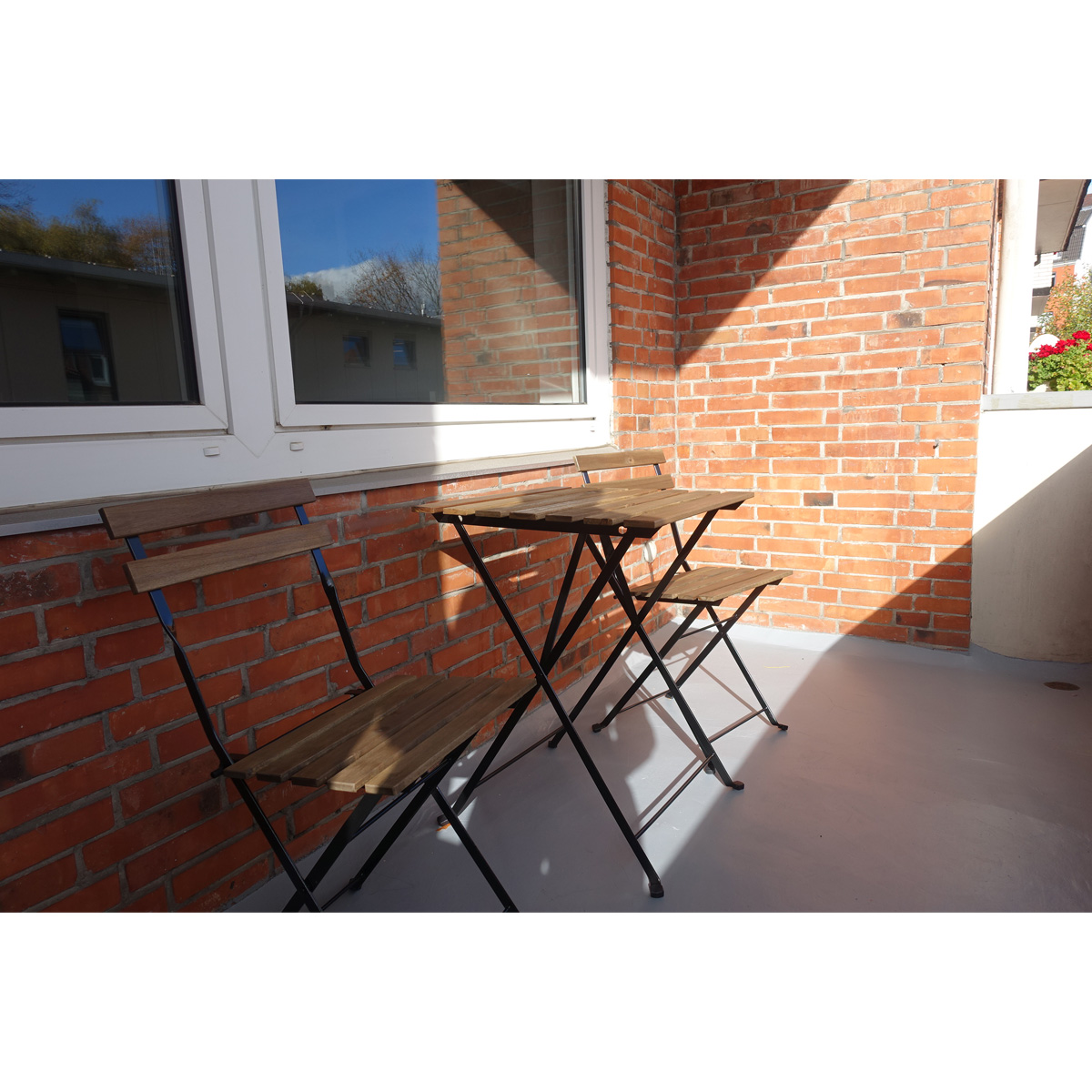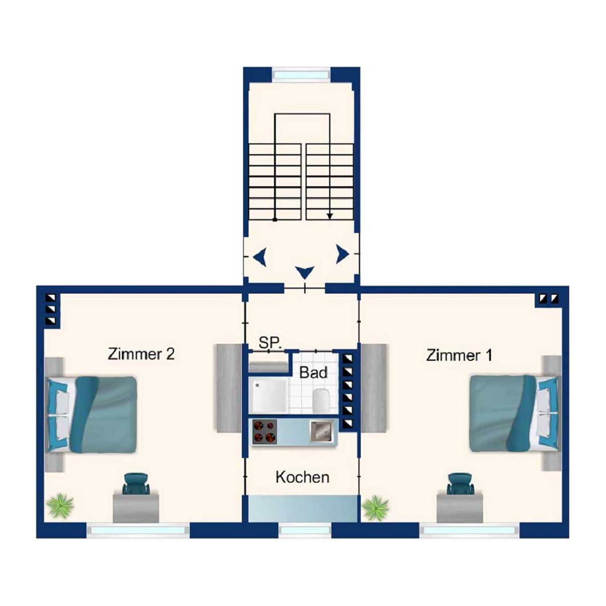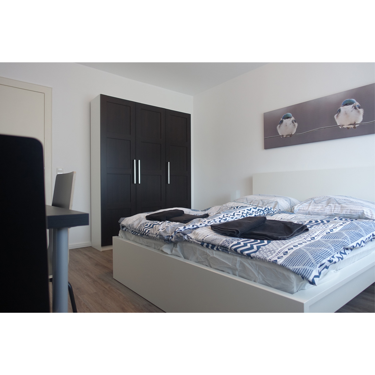 Die hellen 61 qm großen Wohnungen sind unterteilt in zwei Schlafzimmer, ausgestattet mit jeweils zwei freistehenden Einzelbetten und einem Gemeinschaftsraum/Esszimmer. Die Wohnungen bieten ausreichend Platz für vier Personen. Eine komplett ausgestattete Küch mit Geschirrspühler und Waschmaschine und Trockner im Keller bieten beste Voraussetzungen für einen bequemen längeren Aufenthalt. Das kleinere Doppelzimmer verfügt über einen Balkon. WLAN und Kabel-TV sorgen für zeitgemäße Unterhaltung.